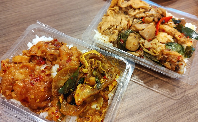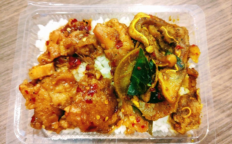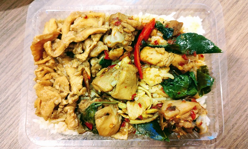 こちらは左側が豚肉のオイスターソース炒めに、右側がチキンカレーとなっております。