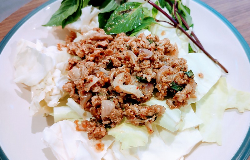 屋台でついてくるキャベツは少量なので、家でマシマシにしてみました。このスパイいーな豚ひき肉をキャベツにのっけていただくと、本当に美味しいんですよ。