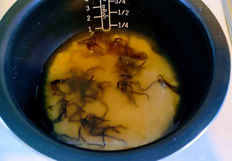 炊飯器にお米と、規定量の水を張って、そこに塩昆布をお米1合あたり2~3つまみほど放り込みます。