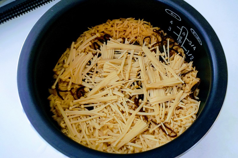 炊き込みご飯って、味が強すぎると食べるのがしんどくなってくるので、このくらいがちょうどいいんです。