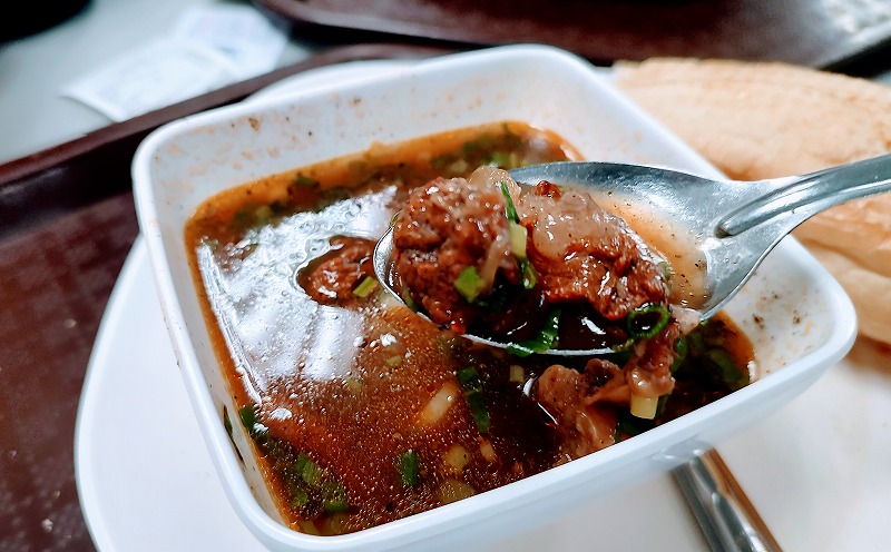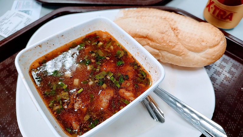 ビーフシチュー(スープ)に、フランスパンのセットで80B(≒¥320)。