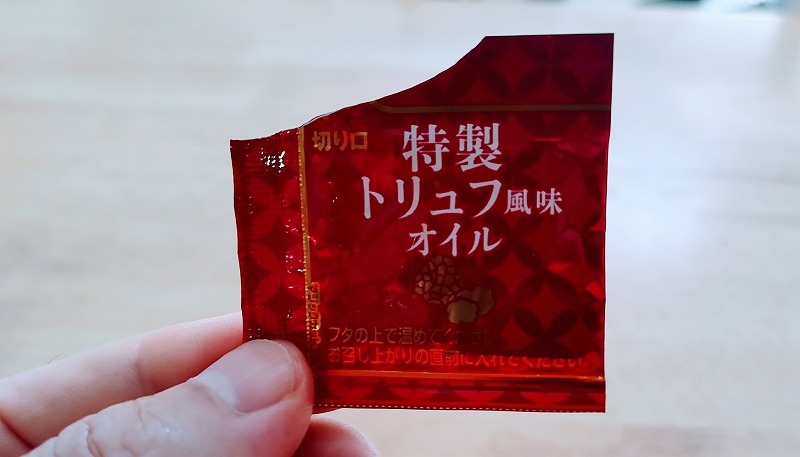 そのため今回は、「特上」の中で一番美味しいと噂の「特上 カップヌードル 特製トリュフ風味オイル」をいただくことにしました。