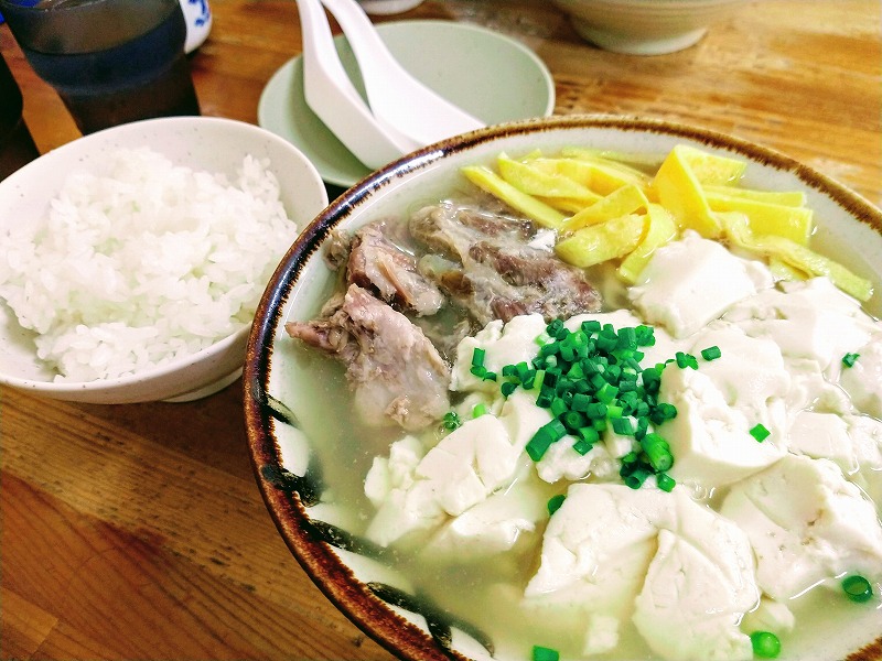 ふわふわの食感とほのかな塩味のゆし豆腐が、豚骨ベースで塩味という浜屋の独特のスープと一体になったこの味は他に代えがたい。