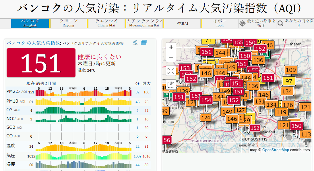 リアルタイムで大気汚染をチェックできるこちらのサイトによると、本日のバンコクの大気汚染指数(AQI)は151で、「健康に良くない」となっています。